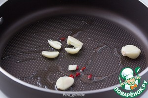 2. Рыбу очистить от чешуи, внутренностей, удалить жабры и плавники. Промыть. На разогретой сковороде с высокими бортиками в оливковом масле слегка обжарить раздавленный чеснок, мелконарезанный перец.