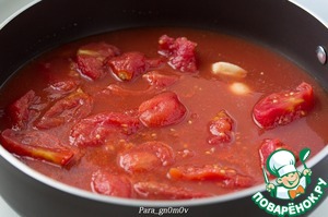 3. С томатов снять шкурку (если она есть) и нарезать на дольки. Я нарезала на дольки, но мне затем захотелось, чтобы кусочки были поменьше и я в процессе приготовления еще измельчила их с помощью лопатки. Поэтому ориентируйтесь на свой вкус, возможно, лучше сразу порезать томаты помельче. Добавить томаты и сок из-под них к чесноку.