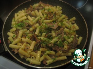 Последний штрих: добавляем макароны к мясу и даём потомиться ещё 5-8 минут (пусть все ингредиенты "познакомятся и привыкнут" друг к другу - это важно).