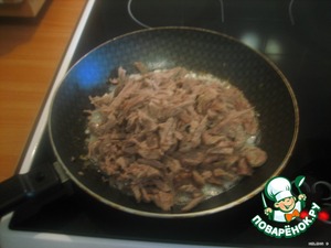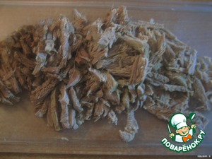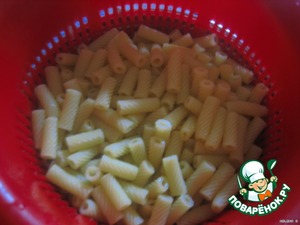 Пока варятся макароны, нарезаем отварное мясо на небольшие кусочки (вдоль волокон), а для маленьких детей лучше провернуть мясо через мясорубку.