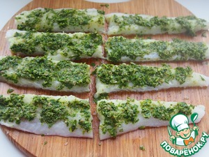 Распределить зеленый соус на полосках камбалы. Полоски рыбки разрезать пополам.