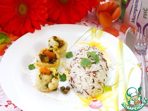 Рецепт «Паровые рулетики из камбалы с зеленым соусом и курагой»:
