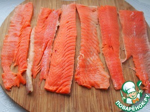 Филе форели порезать на тонкие полоски. -