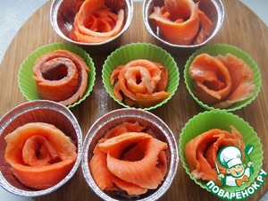 Свернуть полоски рулетиками и поместить их в силиконовые формочки, смазанные оливковым маслом.