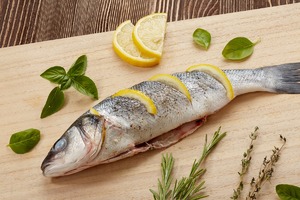 Почистить лимон и разделить на дольки. Сибас посолить, поперчить и сделать надрезы по бокам. В надрезы вставить дольки лимона. -