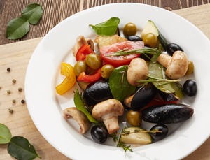 Все овощи нарезать крупно. Добавить соль, перец, масло, оливки, маслины, листья лайма, мидии, вино, уксус. Затем все хорошо перемешать.