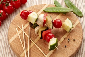 Насадить овощи на шпажки, после чего посолить, поперчить и полить маслом. -