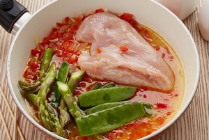 Добавить к курице горох, спаржу и поставить вместе с маринадом запекаться в духовке при температуре 180 градусов на 15 минут.
