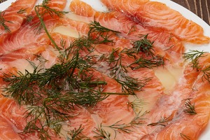 • Лосось промыть и просушить полотенцем. Вытащить кости и нарезать на ломтики.
