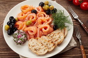 • Лосось выложить на тарелку, рядом положить маслины, оливки, гренки и порезанный лук. При подаче полить оливковым маслом Extra Virgen.