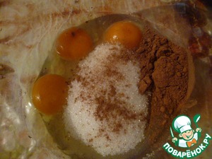3 яйца, 150 г сахара, щепотку соли и 1 столовую ложку какао