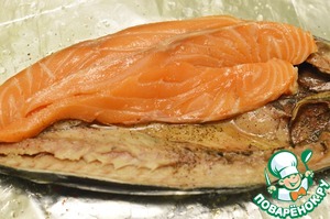 2. Скумбрию разрезать со спины, вынуть внутренности, жабры, удалить хребет, вымыть, обсушить. Фольгу смазать маслом. пропущенным через пресс чесноком. Сбрызнуть лимонным соком и посыпать травами, солью. Выложить рыбу. Семгу нарезать полосками и выложить на половинку скумбрии.