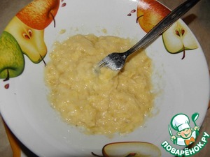 • К бананам добавить кефир, взбитые яйца, ванилин, растительное масло, и сахар. Все хорошо перемешать.