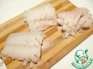 На плите в кастрюле нагреваю масло для фритюра. Филе трески мою, нарезаю филе до шкуры ромбиками (шкуру разрезать не нужно).