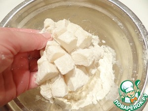 Обваливаю рыбное филе в муке так, чтобы все кубики были в муке.