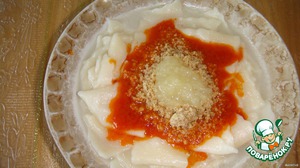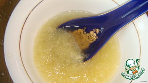 Чеснок давим на чесночнице, добавляем соль и немного воды.