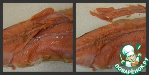Ставим воду под рис и займемся рыбой. Рыба, целая как есть, нам не понадобится. Для кармашков мы ее сначала филируем вдоль пополам. У нас получается две половины. Одна без костей (она нам не понадобится), а другая с хребтом. Вот она и будет нашим главным героем в нашем блюде. Но сначала мы отстрижем реберные кости, которые остались от другой половины при филировании. У нас должна получиться половинка рыбы на ровном костяке.