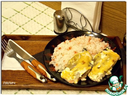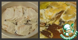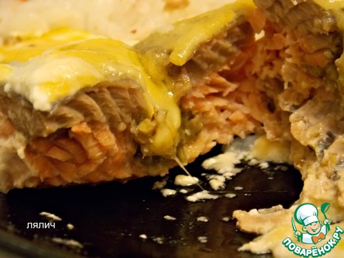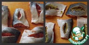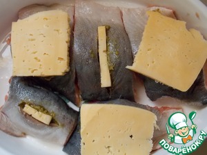 Теперь производим манипуляции с сыром. Режем его на столько кусочков, сколько кусков рыбы. Отрезаем от каждого куска тонкую полоску и вставляем в разрез. Остальной кладем наверх.