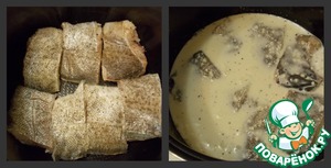 Пока варится гречка, делаем сразу соус. Взбиваем молоко и плавленный сыр до однородности. Филе режем на порции, какие Вам нравятся по размеру. Складываем в чашу мультиварки. Заливаем соусом и немного встряхиваем, чтобы соус попал под рыбу.