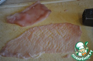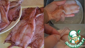Каждую тушку кальмара разрезаем на две части и слегка отбиваем, до увеличения в два раза.