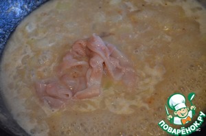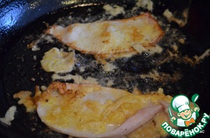 Яйцо смешиваем с солью, перцем, мукой и водой. Кляр должен получиться, как тесто на блины. Обмакиваем отбитую тушку в кляр и кладем на хорошо разогретую сквородку с растительным маслом.