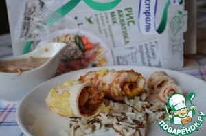 На рис выкладываем рулетики из кальмаров, подаем соус.