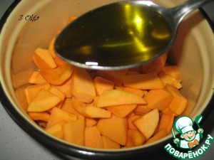 Пока тесто отдыхает, займемся начинкой. Тыкву нарезать небольшими кусочками, сложить в кастрюльку с толстым дном, добавить оливковое масло. На небольшом огне протушить тыкву с маслом до мягкости.