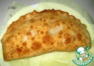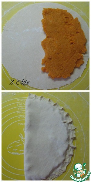 Выкладываем начинку на половину кружка, не доходя до края на 1-1.5см. Осторожно накрываем второй половинкой круга, защипывая края.