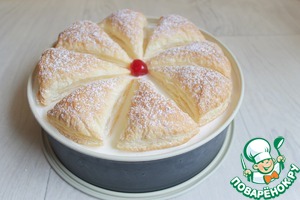 А теперь самое приятное это украшение. Кладем наши треугольнички, и украшаем как хотим. Например можно серединку украсить фруктами но у меня была вишня. И посыпаем сахарной пудрой. Вот такая красота! Угощайтесь!
