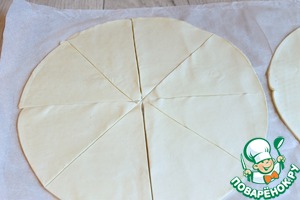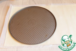 Итак берем два рулона теста слоеноего. Раскатываем и вырезаем два круга диаметром 26см.