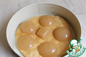 Корж обрезаем меньше формы. Кладем на дно. Когда застынут, опустим их в горячую воду на 3 минуты и перевернем, затем кладем наши мармеладинки на корж.