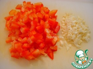 Чеснок и перец нарезать маленькими кубиками.