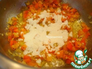 Теперь муку и, перемешивая, продолжаем обжарку еще 1 минуту.
