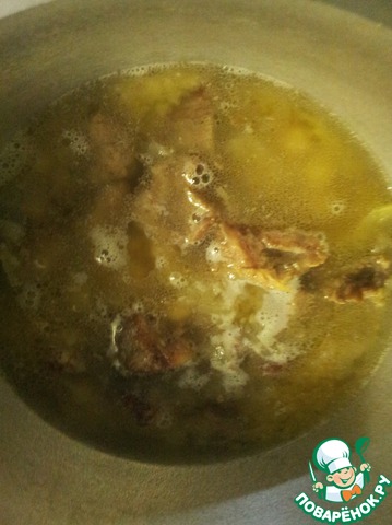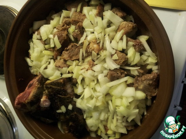 Блюдо нужно готовить в открытой посуде, я использовала керамическую. подрумянить кости и порезанное кубиками мясо