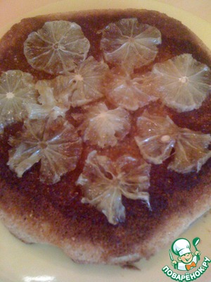Готовый пирог немного остудить, выложить на него лимоны и полить глазурью. Через полчаса можно пробовать