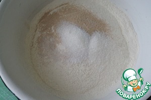 Берем 250 грамм муки, смешиваем с дрожжами, солью и сахаром.