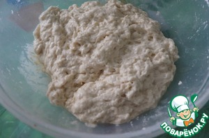 И руками вмешиваем все это в тесто. Вмешивается довольно быстро и без усилий. Получаем вот такую кашку. Затем добавляем оставшуюся муку. У меня ушло 100 грамм, но у вас может и другое количество, кто знает. Ориентируемся на то, чтобы получить мягкое тесто, но не липнущее к рукам. Опять под пленку и на расстойку до увеличения в 1.5-2 раза. Включаем духовку на 190 градусов.