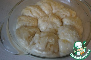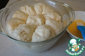 После того как выложим все шарики, опять накрываем и минут на 20 оставляем в покое. За это время тесто опять поднялось.