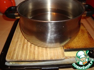 Теперь надо поставить на гнет и оставить при комнатной температуре минут на 30, чтобы коржи спрессовались. Дико извиняюсь, но кроме 2-х разделочных досок и кастрюли с водой в тот момент мне на ум больше ничего не пришло.