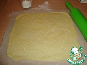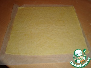 Раскатать одну часть в тонкий корж по размеру противня на бумаге для выпечки. Это мы делаем, чтобы удобнее было переносить корж, т. к. он очень тонкий. У меня размер противня 36Х33 см.. После выпекаем корж в духовке при 200 градусах - 10-15 минут, до золотистого цвета. Ориентируйтесь по своей духовке.