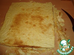 Если вы изначально коржи не обрезали, то сложить их один на один, только аккуратно, т. к. коржи хрупкие и обрезать под один.