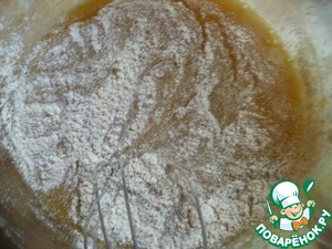 Затем добавить просеянную пшеничную муку смешанную с содой.