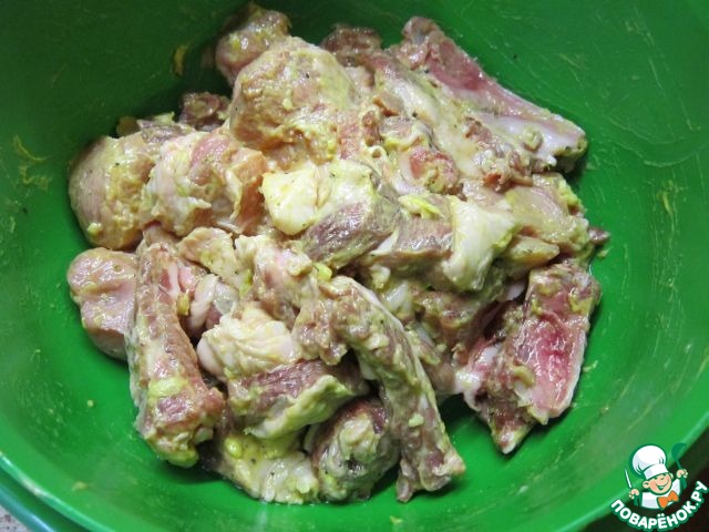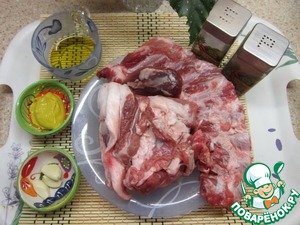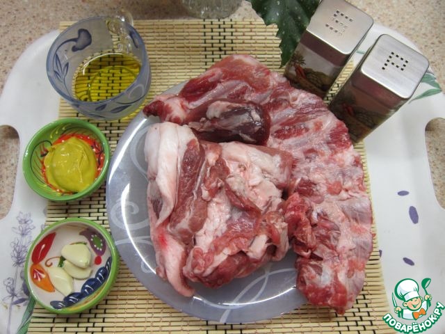 Свинина+чеснок+горчи ца+оливковое масло+соль+перец=пер емешать