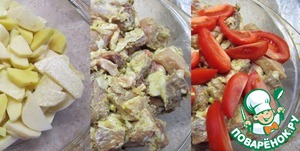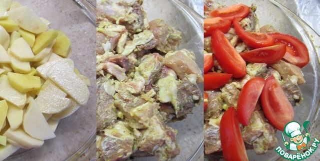 Выложить картошку, мясо, помидоры, лук. -