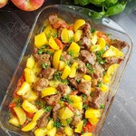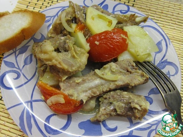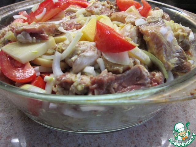 Горчица, которая входит в состав маринада, придает пикантность всему блюду. Мясо получается нежным, картошка - ароматной, а помидоры и лук придают блюду свежую нотку.