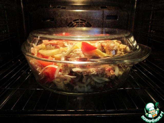 Готовность определяется по готовности картошки и зажаренности верхних кусочков мяса.