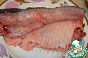 Подготавливаем рыбу, она должна быть свежая, не мороженная. Рыбу беру уже чищенную, прошу чтобы ее почистили на рынке. А вот потрошу у же дома. Для этого на гребте нужно сделать вдоль два надреза, затем ножнцами надрезать хребет у головы и хвоста.