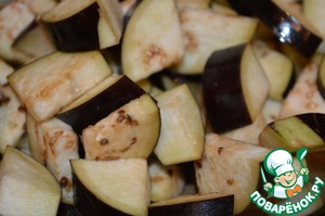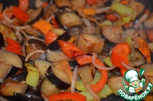 На сильном огне с 1 ст. л. растительного масла сначала обжарить 1 минуту баклажан, а затем добавить лук, перец и половину имбиря. Обжаривать еще 2 минуты, влить 2 ст. л. соевого соуса и снять с огня.
