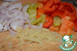 Перец разрезать на четыре части, а затем нарезать толстой соломкой. Лук нарезать тонкими полукольцами, имбирь измельчить.