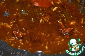 Для соуса в небольшом сотейнике растапливаем сахар в 3 ст. л. воды. Добавляем 2 ст. л. соевого соуса, оставшийся имбирь, бадьян и рисовый уксус. Опять разводим 1 ст. л. кукурузного крахмала в 2 ст. л. воды и тонкой струйкой вливаем в соус, тщательно перемешивая его. Полученным соусом смазаваем готового карпа перед подачей.